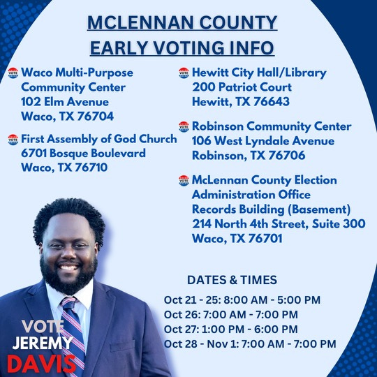Now is the time to make your voice heard! 🗳️ Skip the Election Day lines and cast your vote early for Jeremy Davis for County Commissioner, Precinct 2. Jeremy is dedicated to improving our community through economic development, infrastructure repair, and supporting vital services—and he needs your vote to make it happen!
